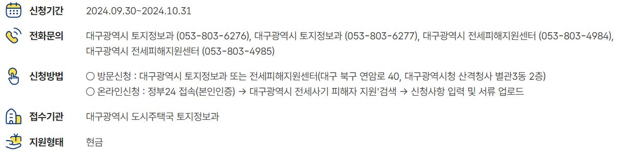 • 온라인 신청: 정부 24에서 '대구광역시 전세사기 피해자 지원'을 검색하여 본인 인증 후 신청서 작성 및 서류 업로드