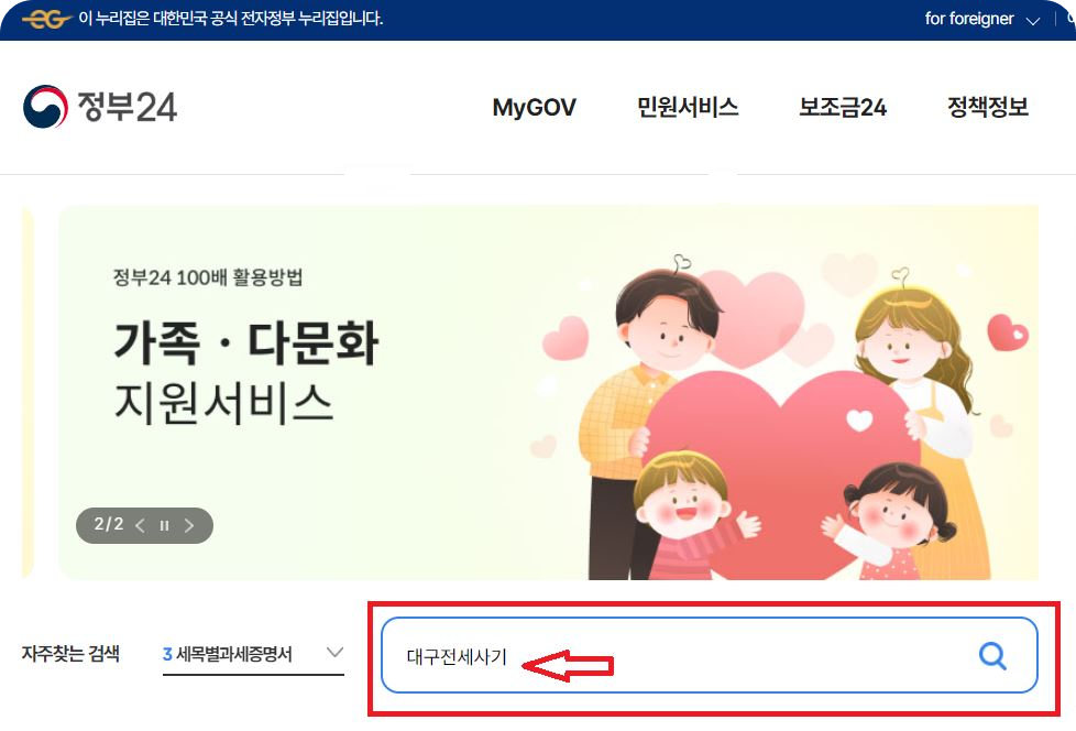 정부 24 웹사이트에서 전세사기 피해자 지원금을 신청할 수 있습니다. 정부 24 홈페이지에 접속 후 '대구전세사기'를 검색 후 아래의 사진처럼 클릭, 신청서 작성 후 필요한 서류를 스캔하여 업로드합니다.