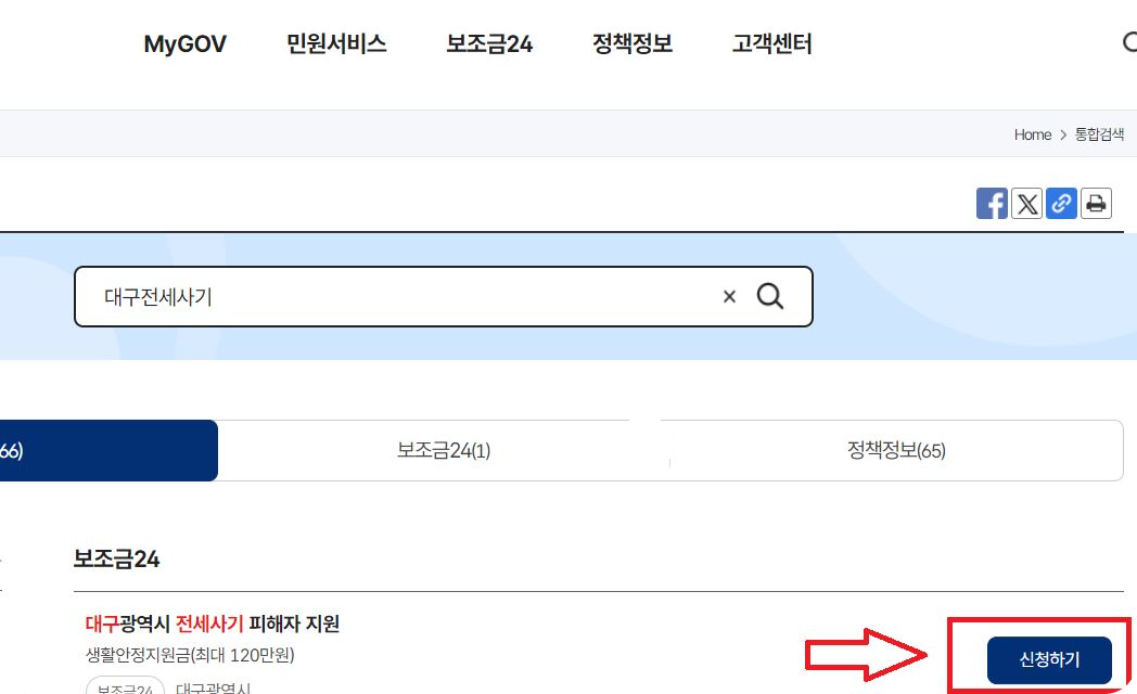 정부 24 웹사이트에서 전세사기 피해자 지원금을 신청할 수 있습니다. 정부 24 홈페이지에 접속 후 '대구전세사기'를 검색 후 아래의 사진처럼 클릭, 신청서 작성 후 필요한 서류를 스캔하여 업로드합니다.
